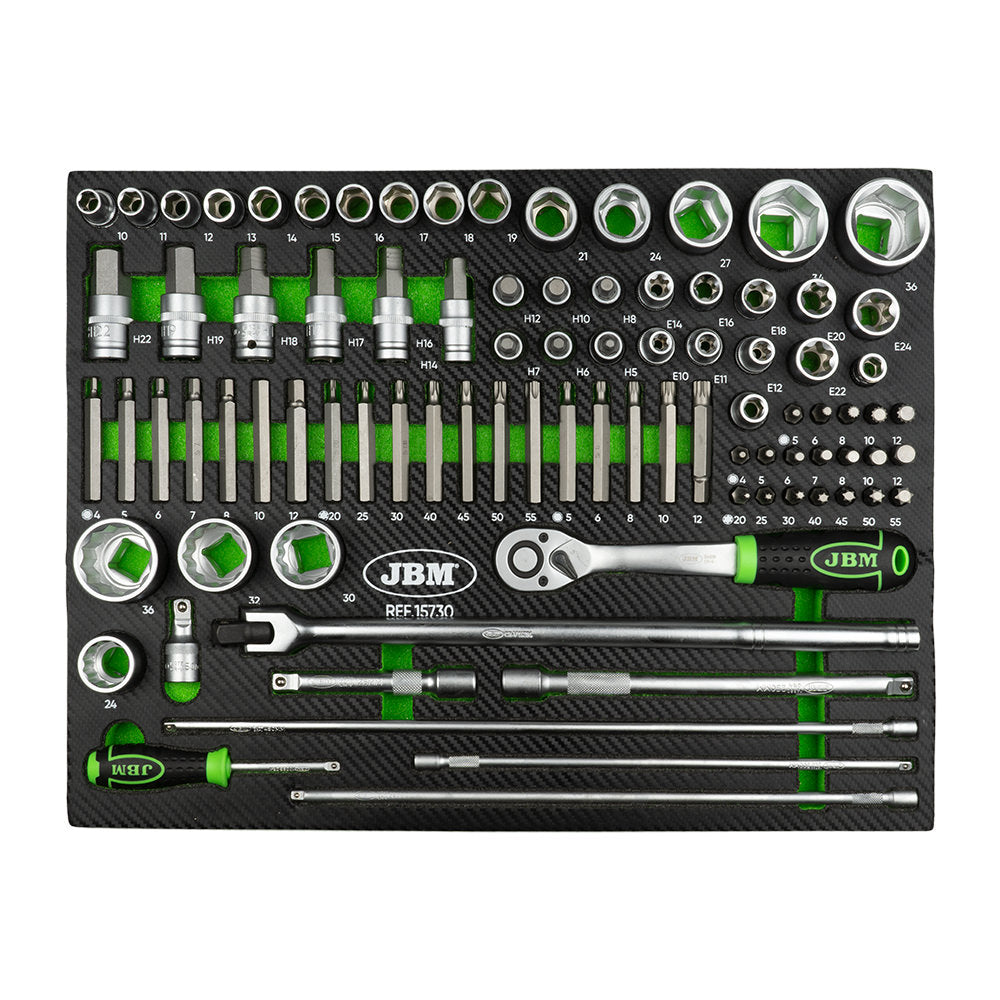 - x10 metric hex sockets: 10, 11, 12, 13, 14, 14, 15, 16, 17, 18, 19mm.